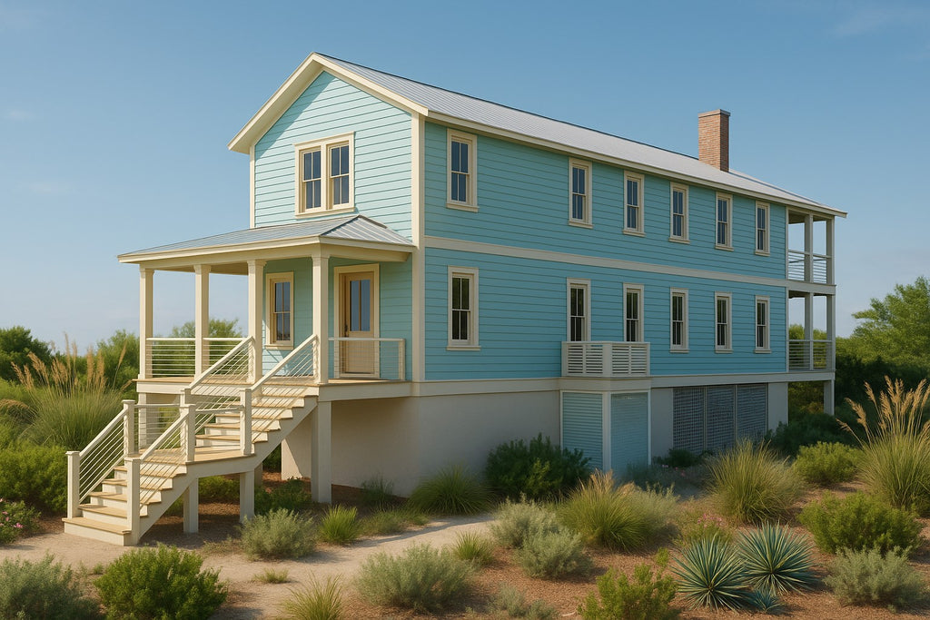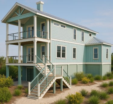 Exterior Features: Elevated House Plans, Narrow lot House Plans, Deck/porch on Front, deck/porch on rear, outdoor fireplace, Metal roof, Garage Entry-rear