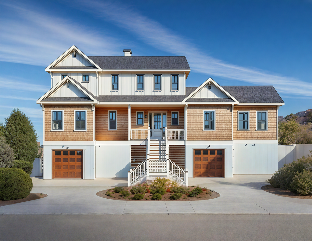 Exterior Features: Front and side entry garage, elevated house plan, deck/porch on front, deck/porch on rear